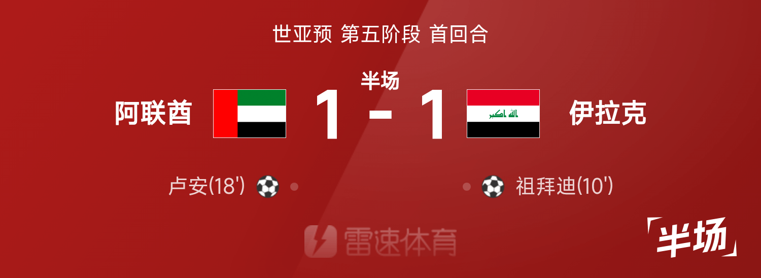 世亚预半场:祖拜迪、卢安各自进球,阿联酋暂1-1伊拉克