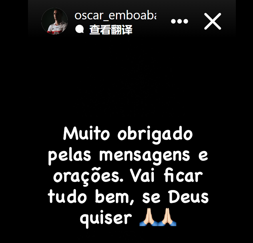 如今奥斯卡通过社媒发布动态:“非常感谢大家的慰问和祈祷,一切都会好起来的,愿神保佑。”