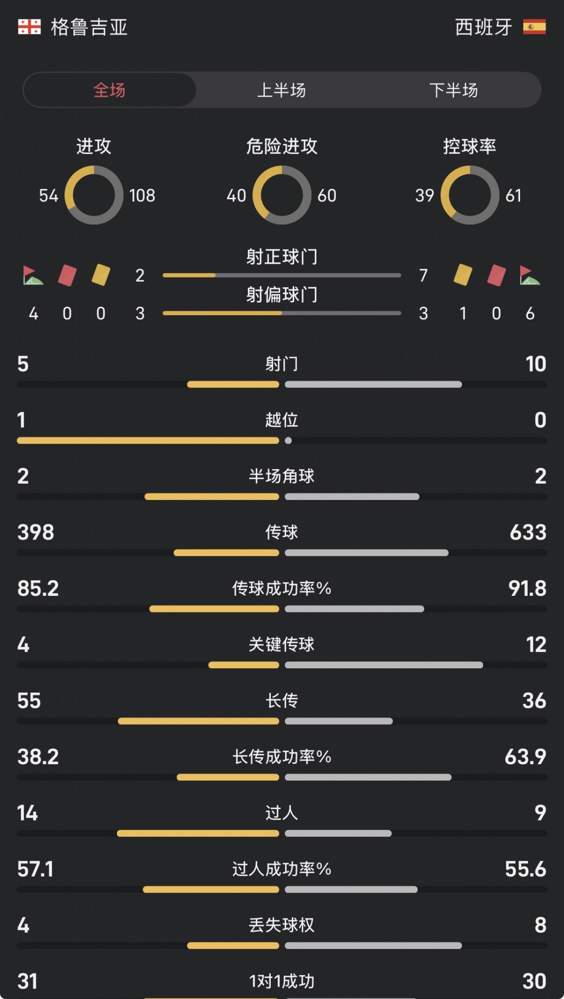 西班牙vs格鲁吉亚全场:盘球率61-39,打门10-5