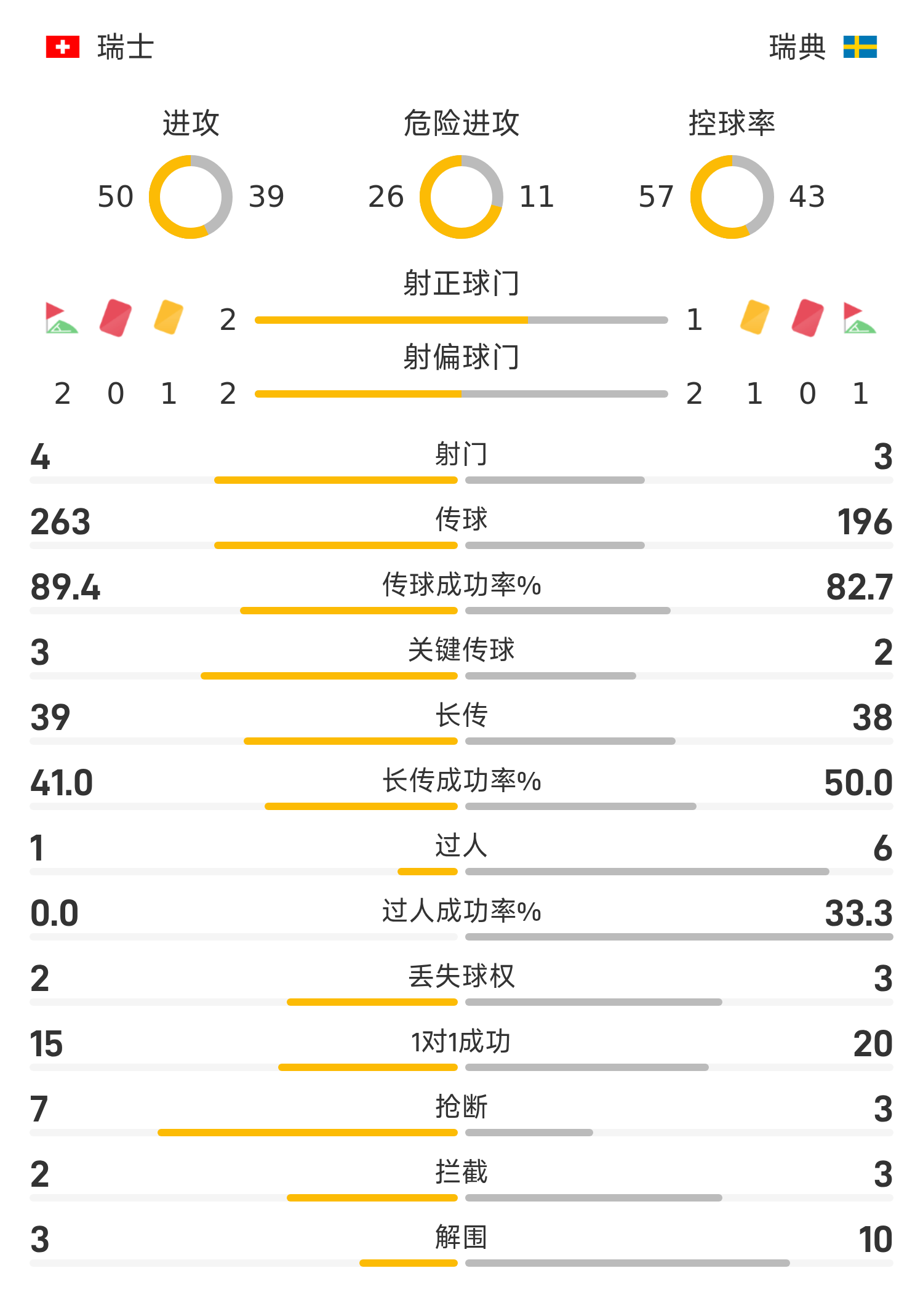 瑞士首发阵容:1-科贝尔、13-罗德里格斯、3-威德默、4-埃尔维迪、5-阿坎吉、10-扎卡、20-阿比切尔、17-巴尔加斯、22-里德尔、11-恩多耶、7-恩博洛
