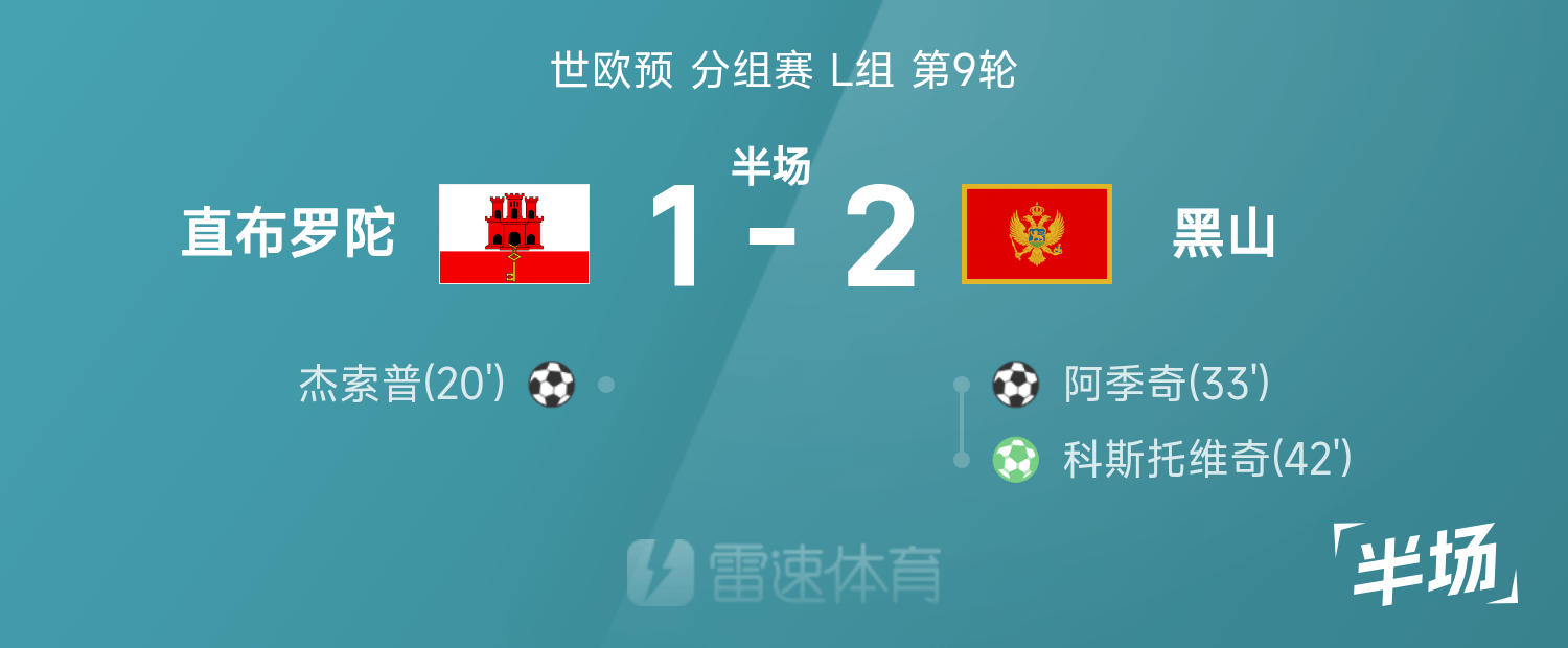 世欧预半场:杰索普建功,阿季奇破门,黑山2-1直布罗陀