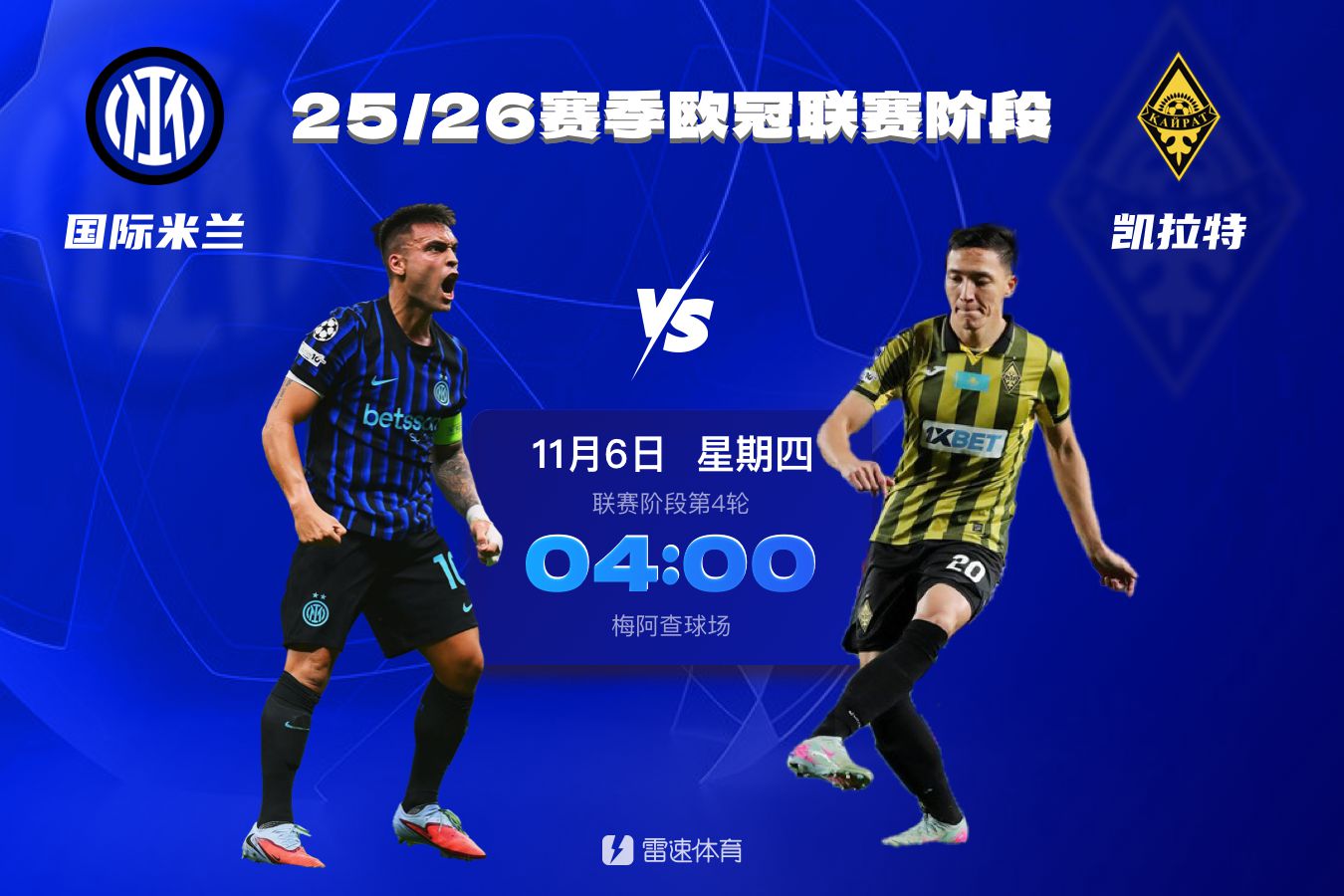 6686体育官网11月5日讯 北京时间6日凌晨4时,欧冠联赛事阶段第四轮,国际米兰将坐镇主队场对阵哈萨克斯坦球队凯拉特。