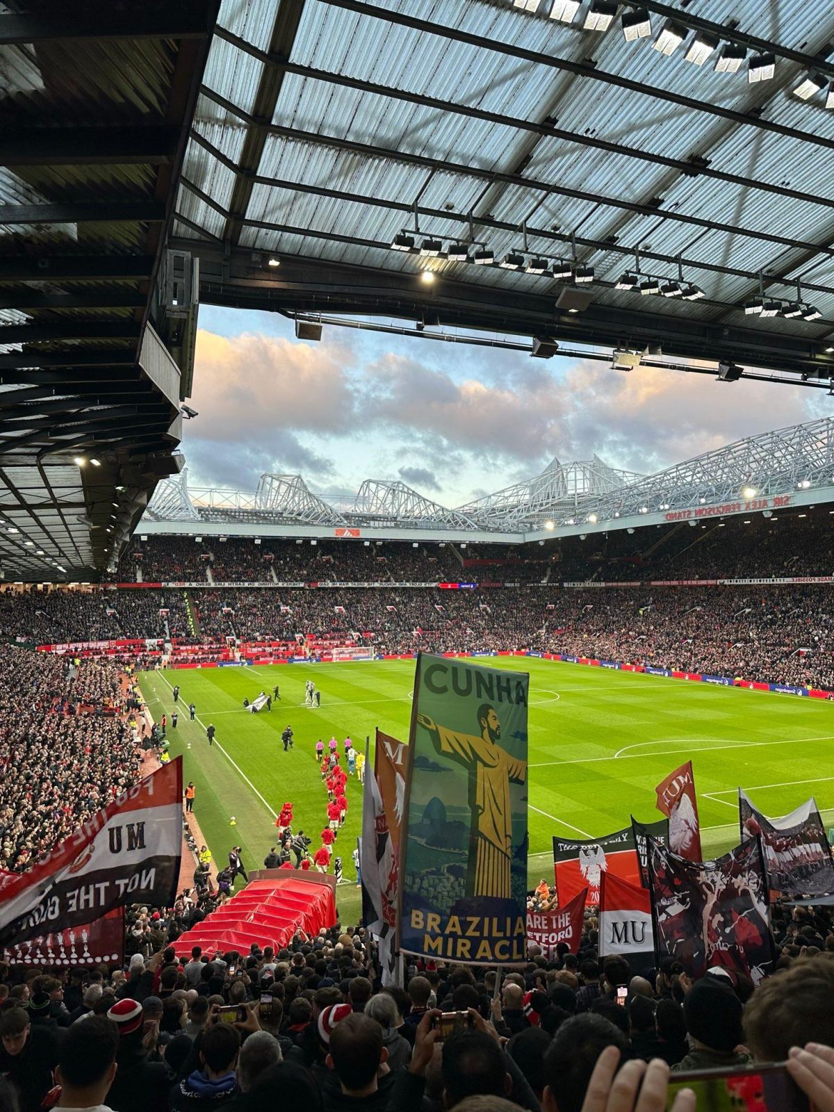 而今夏引援加盟的巴西国脚库尼亚也在本场竞赛打进他个人曼联首球,赛前有球迷举着印有库尼亚版“耶稣像”的旗帜被拍下。
