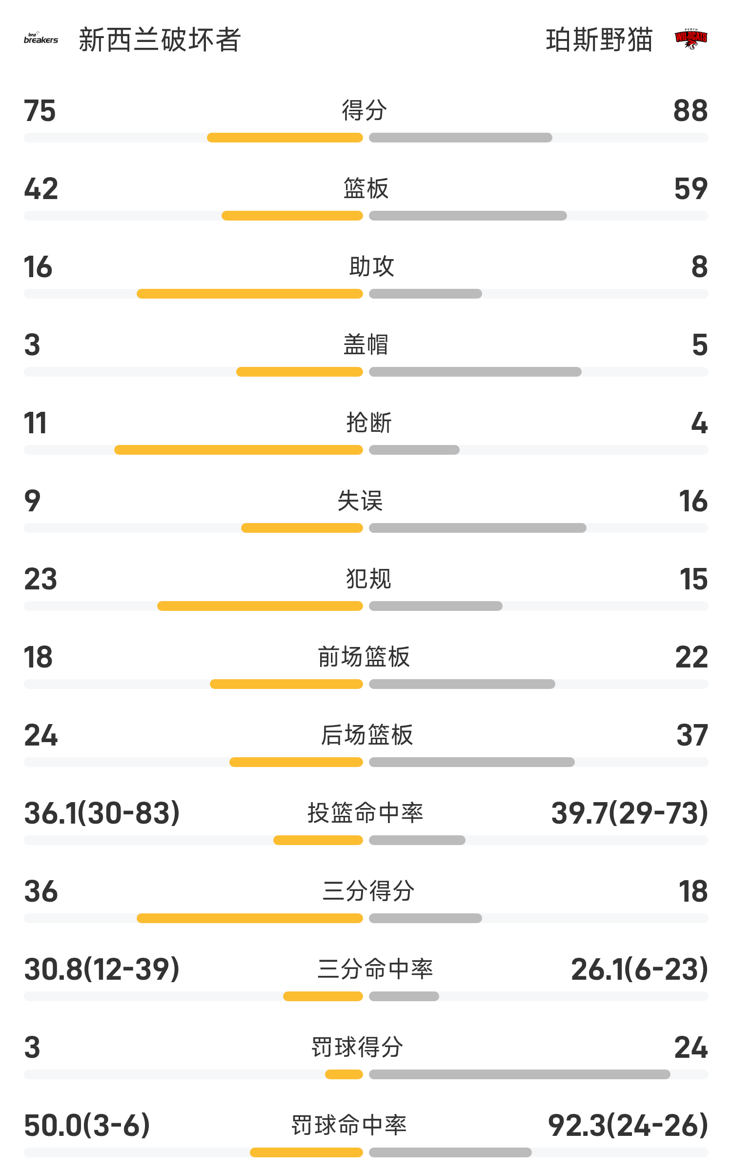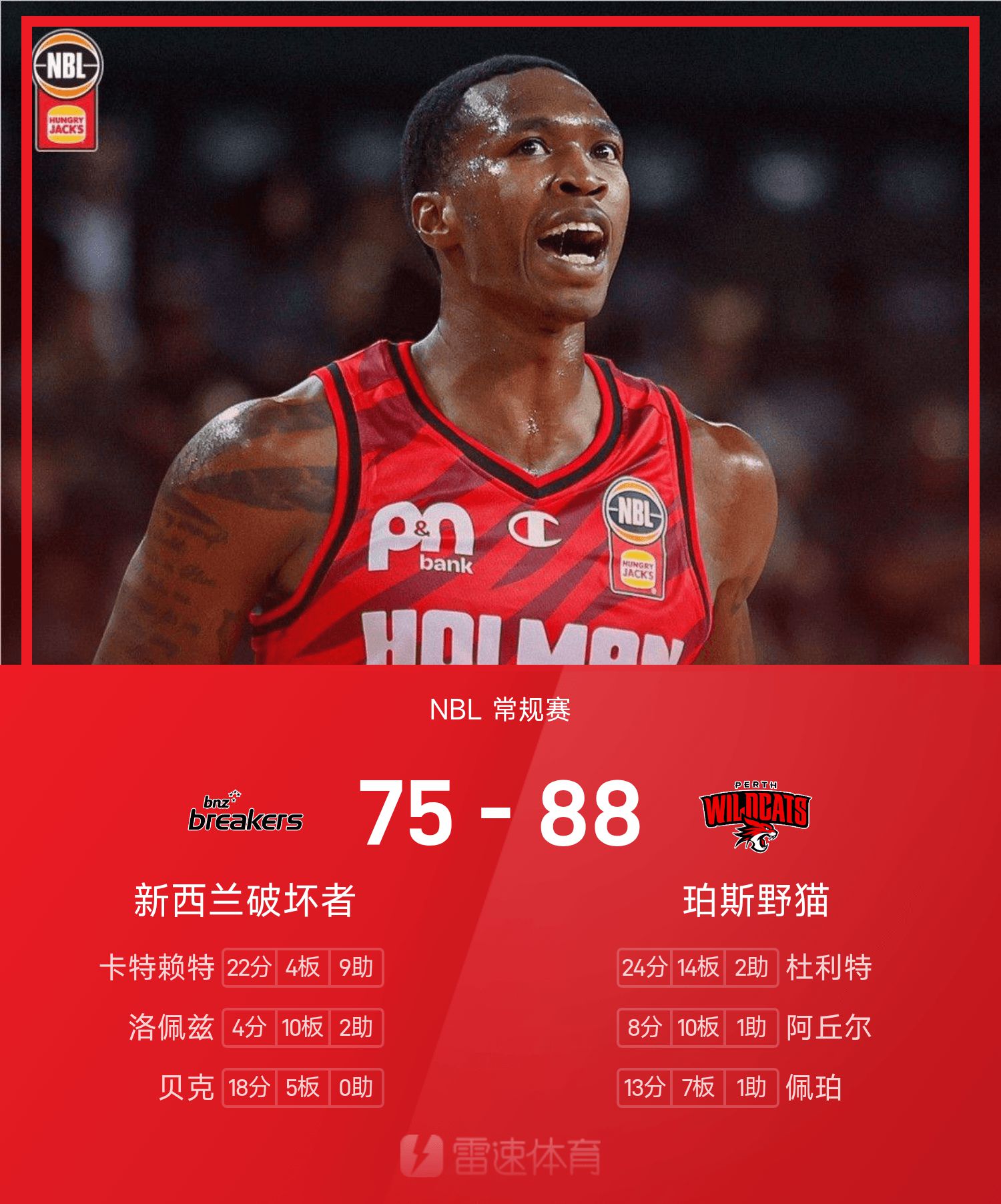6686体育官网11月15日讯 25/26赛季NBL 常规赛,珀斯野猫对阵新西兰毁坏者。双方全场战罢,珀斯野猫88-75战胜新西兰毁坏者。杜利特砍下全场最高的24分14板2助,率领珀斯野猫胜利取胜。
