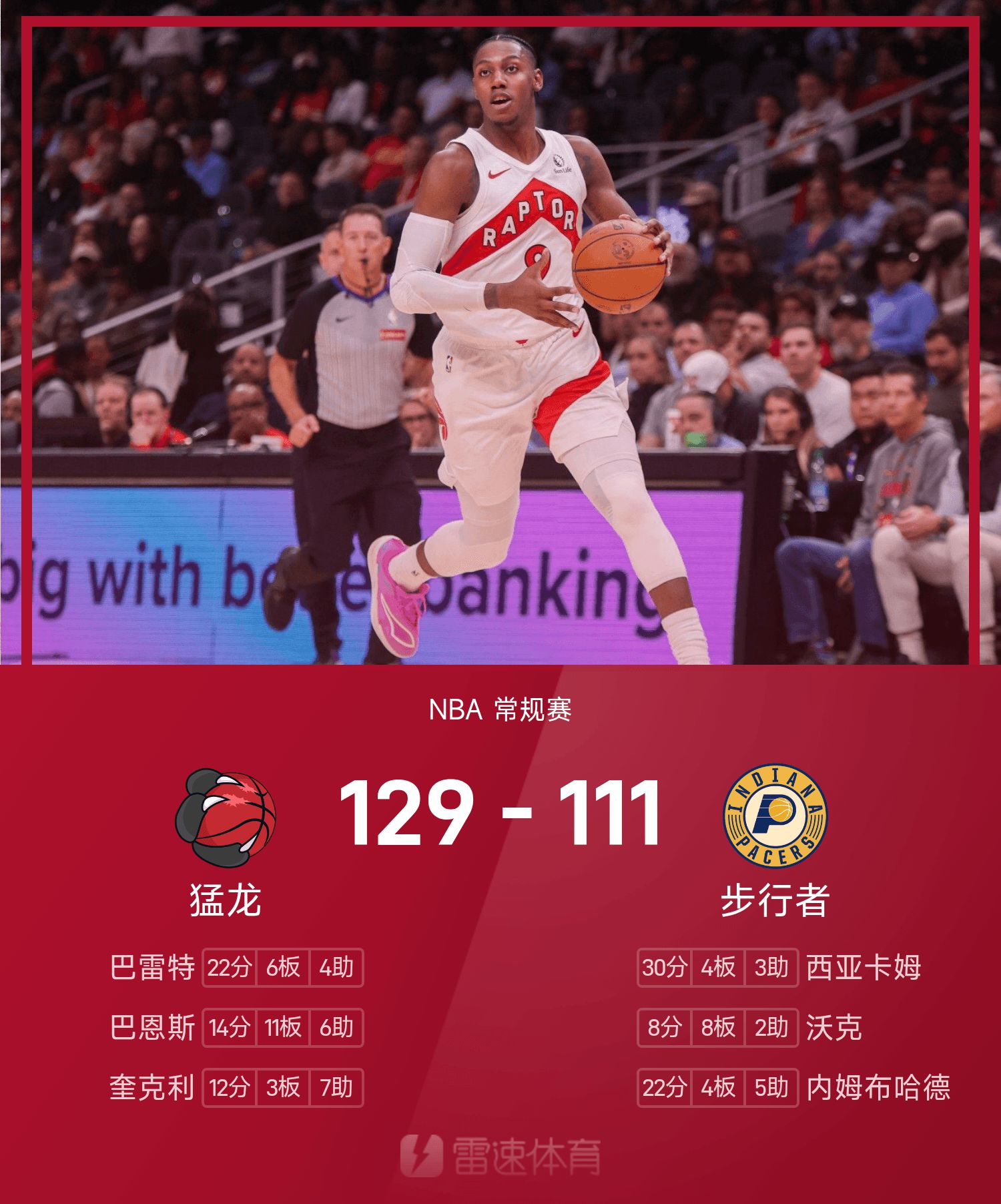 NBA战报:巴雷特22分6板,猛龙129-111轻取步行者