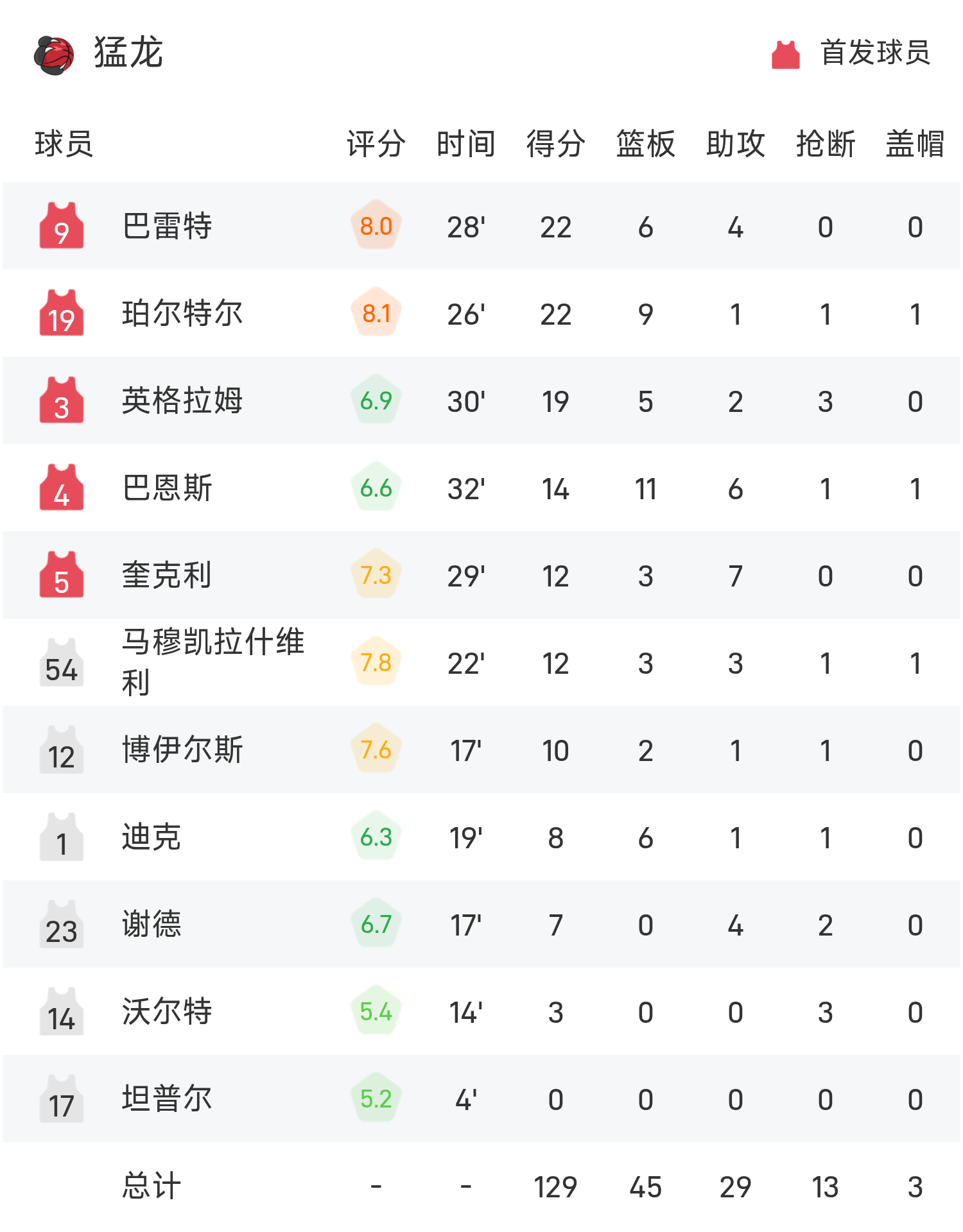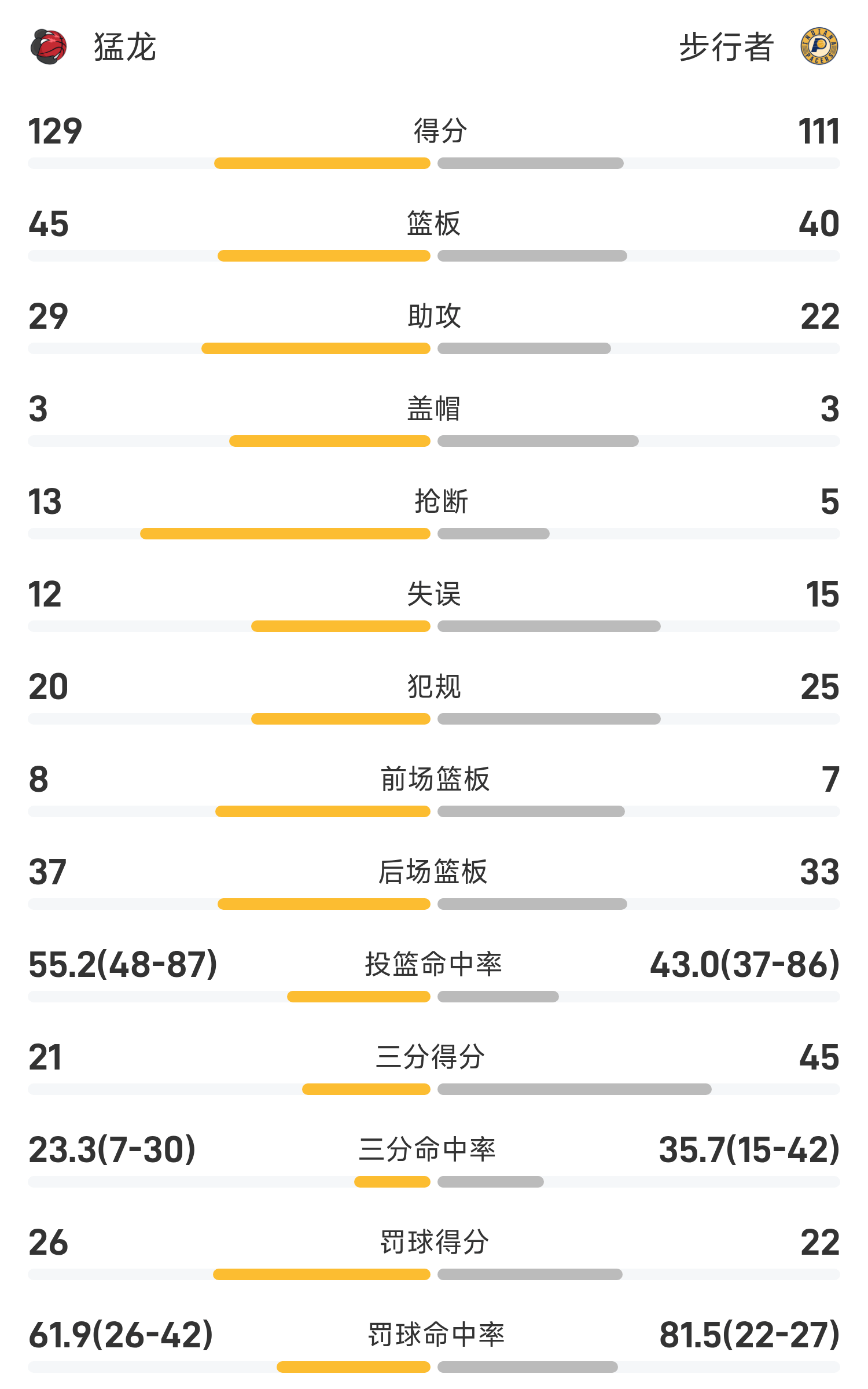 双方全场战罢,步行者111-129不敌猛龙。