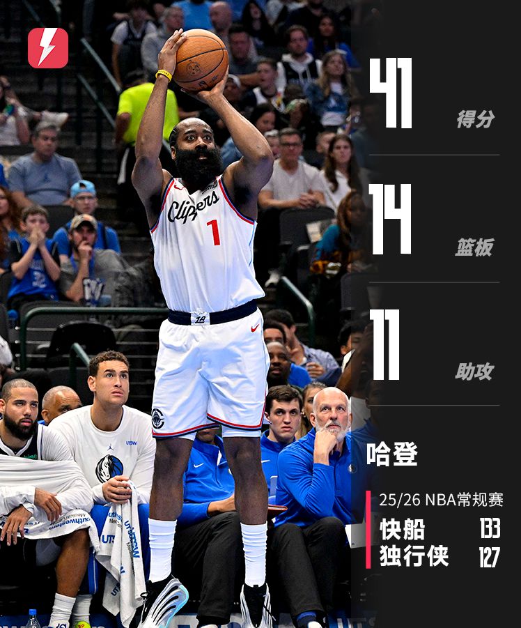哈登也成为了历史上最老砍下40+三双的球员,他的优秀表现协助快船终结6连败。