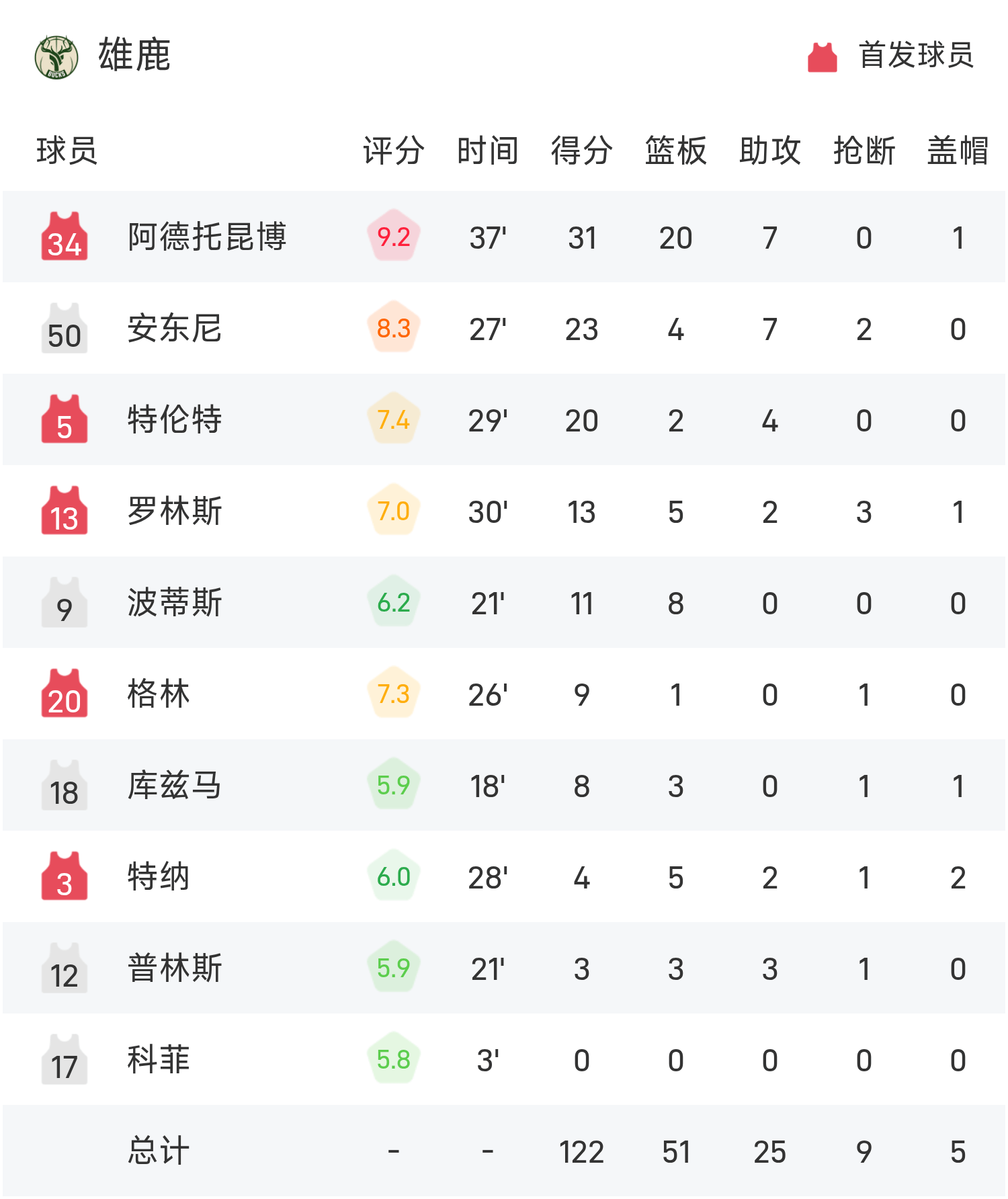 NBA战报:阿德托昆博31分20板7助,雄鹿122-116击败猛龙