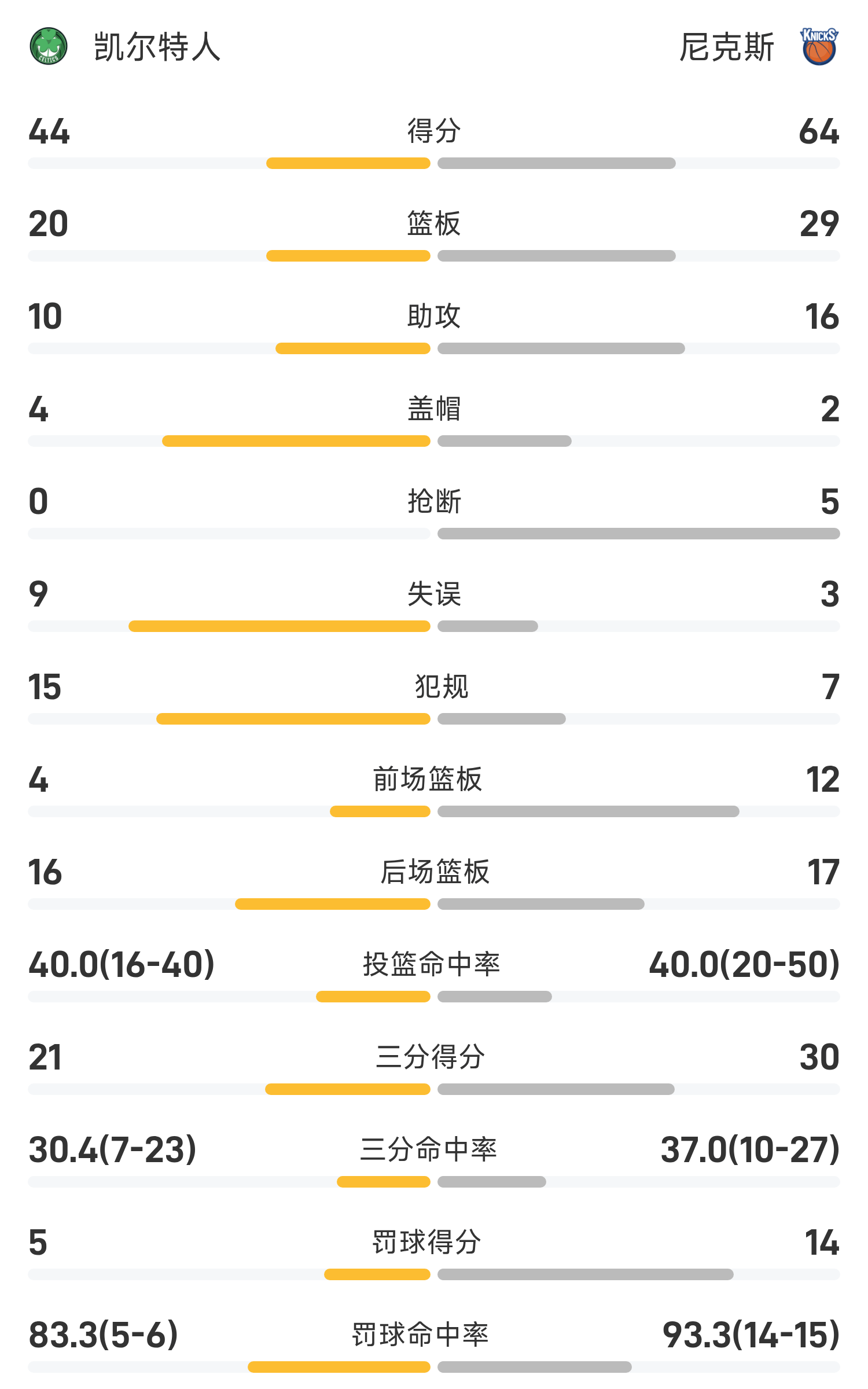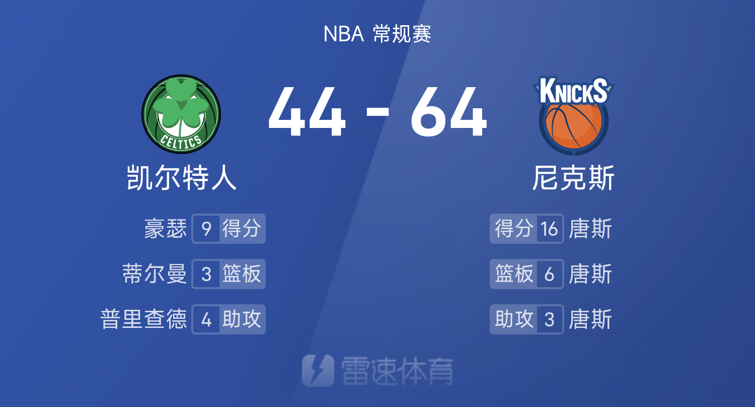 6686体育官网10月25日讯 25/26赛季NBA 常规赛,尼克斯对阵凯尔特人。双方半场战罢,尼克斯64-44领跑位凯尔特人。