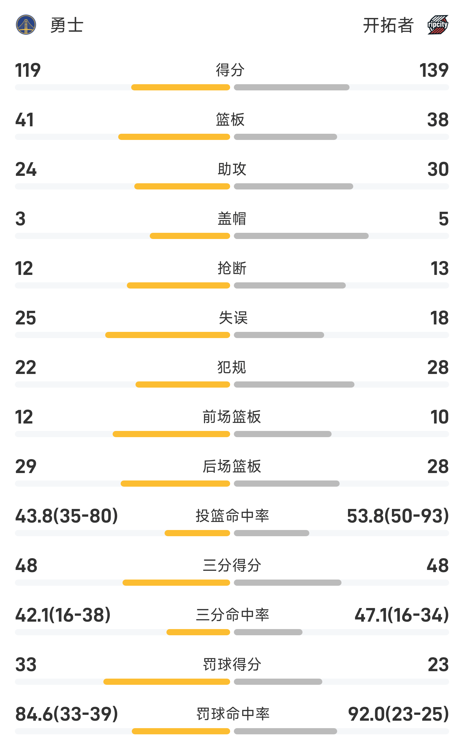 6686体育官网10月25日讯 25/26赛季NBA 常规赛,开拓者对阵勇士。双方全场战罢,开拓者139-119战胜勇士。阿夫迪亚得到26分5板6助率队取胜,库里空砍全场最高的35分6板3助。