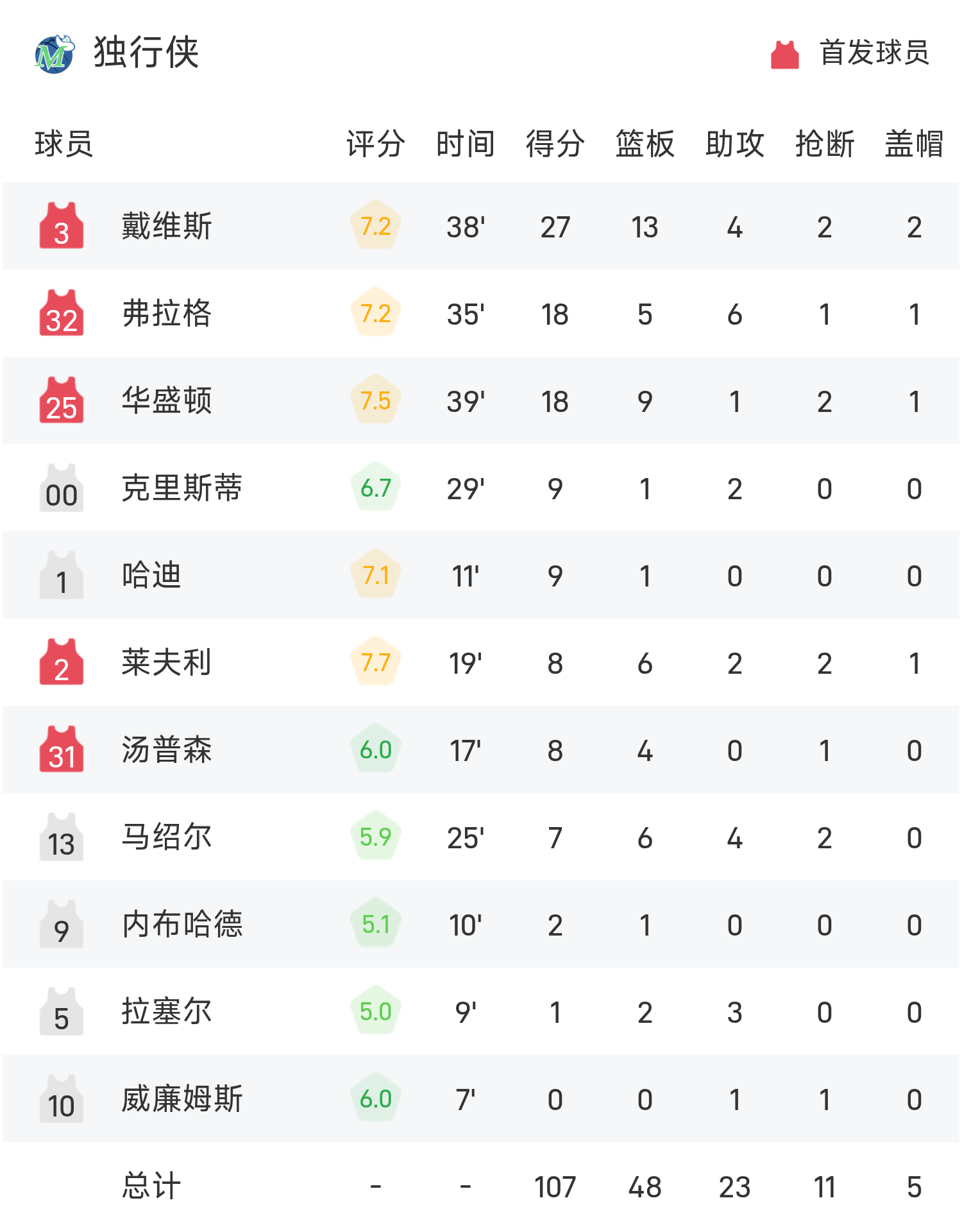6686体育官网10月25日讯 25/26赛季NBA 常规赛,独行侠对阵奇才。双方全场战罢,独行侠107-117不敌奇才。乔治砍下全场最高的34分11板4助,率领奇才胜利取胜。