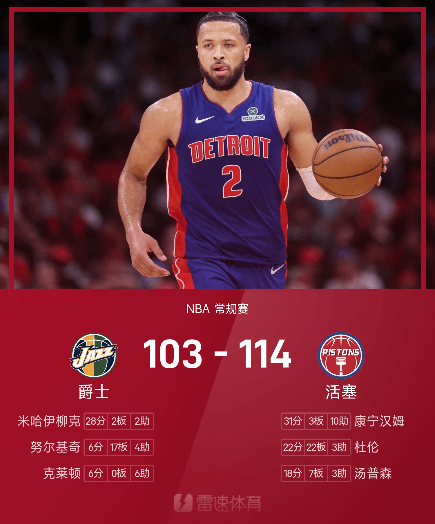 康宁汉姆31分10助攻,杜伦22分22抢篮板,活塞击败爵士。
