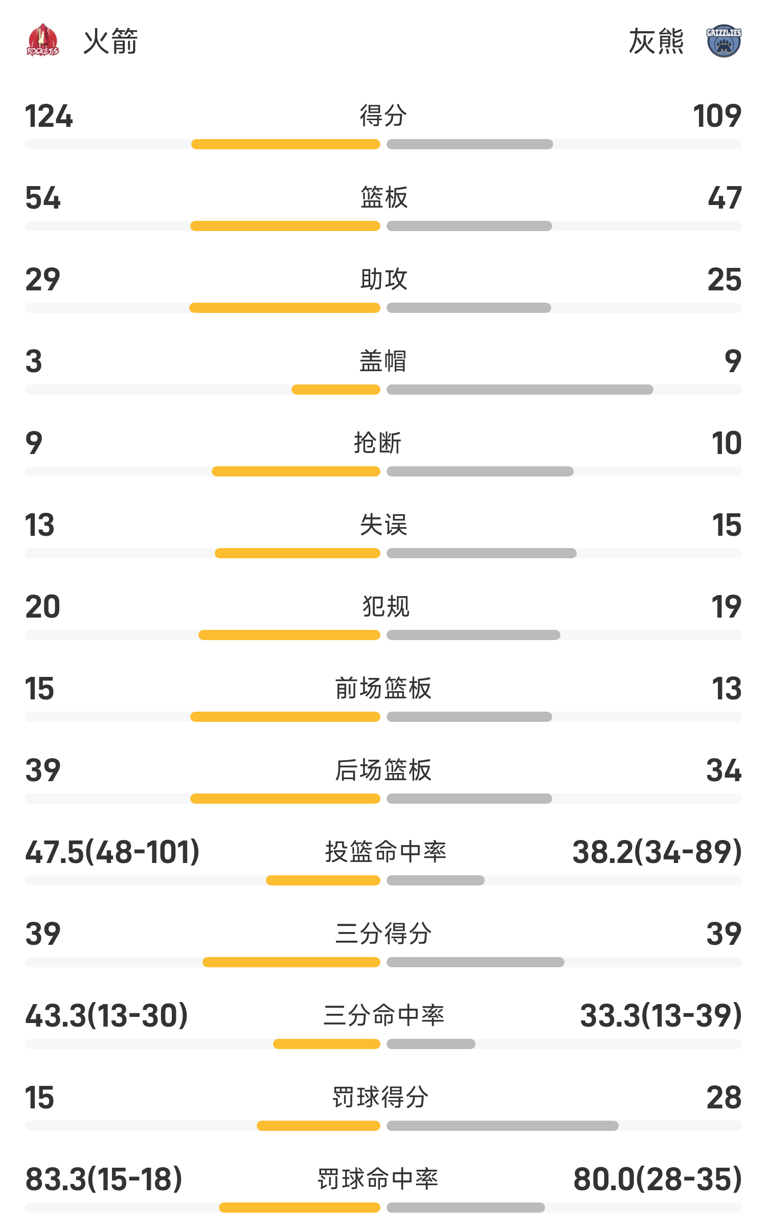 6686体育官网11月06日讯 25/26赛季NBA 常规赛,灰熊对阵火箭。双方全场战罢,灰熊109-124不敌火箭。阿门·汤普森砍下全场最高的28分10板7助,率领火箭胜利取胜。