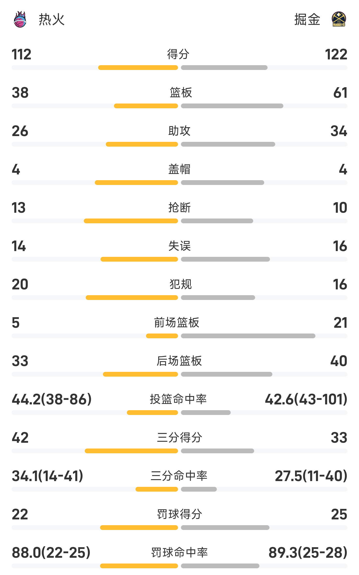 双方全场战罢,掘金122-112战胜热火。